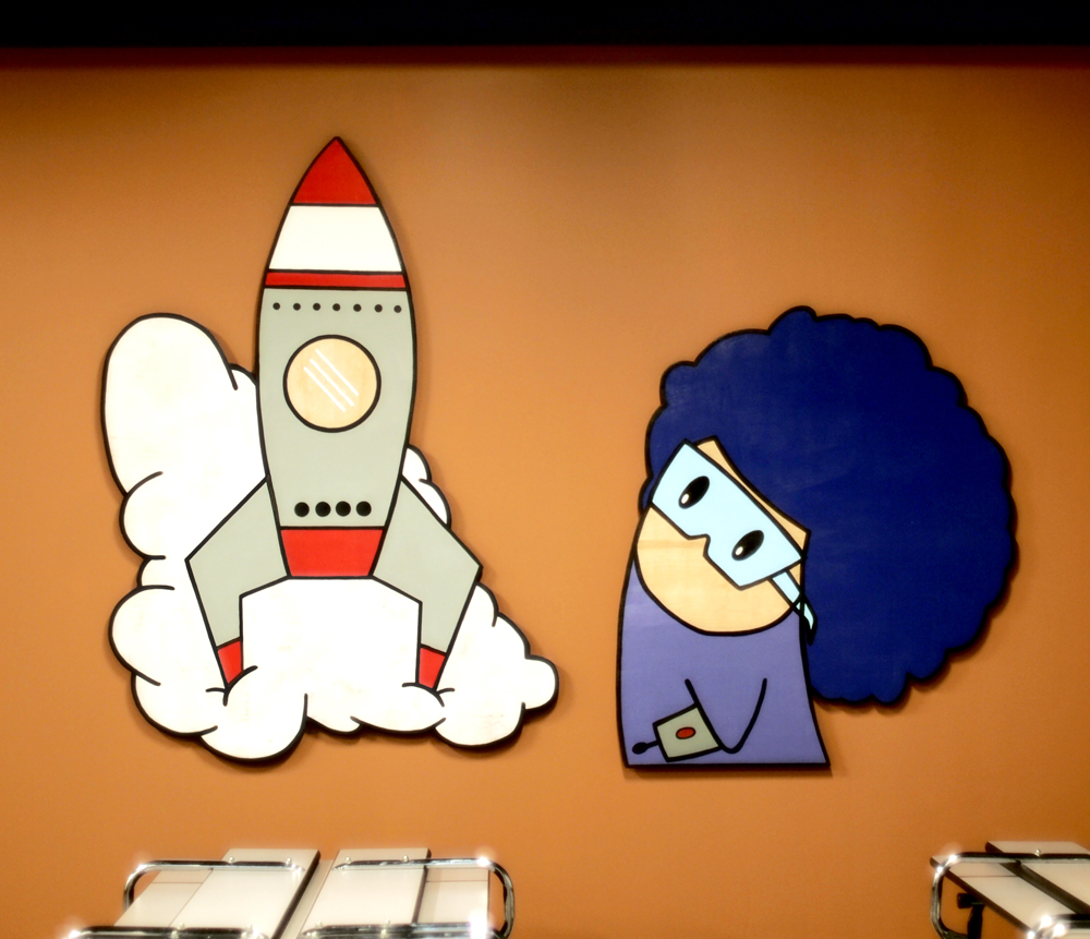 “The Rocketeer” Published on March 23, 2014 in ToeHeads At the Center Of Science And Industry MuseumFull resolution (1000 × 861) ← Previous Next → “The Rocketeer”: Acrylic on baltic birch plywood. 3-D cutouts.