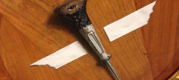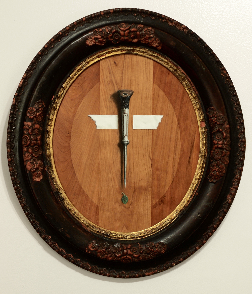 Today I’m introducing my latest fine art painting. It’s called “Absolute: Privilege” and features an antique scratch awl, two pieces of ripped paper, and a leaf from a blooming cherry blossom. The piece is painted on reclaimed cherry wood and is mounted into a frame from the 1800’s. All of the hardware on the back is hand-made specifically for this piece. Totaling around 17″ tall by 15 1/4″ wide (framed), the piece is actually a rounded rectangle recessed into a the carved out rectangle in the back of the frame. This space was where the original photograph and glass were mounted.