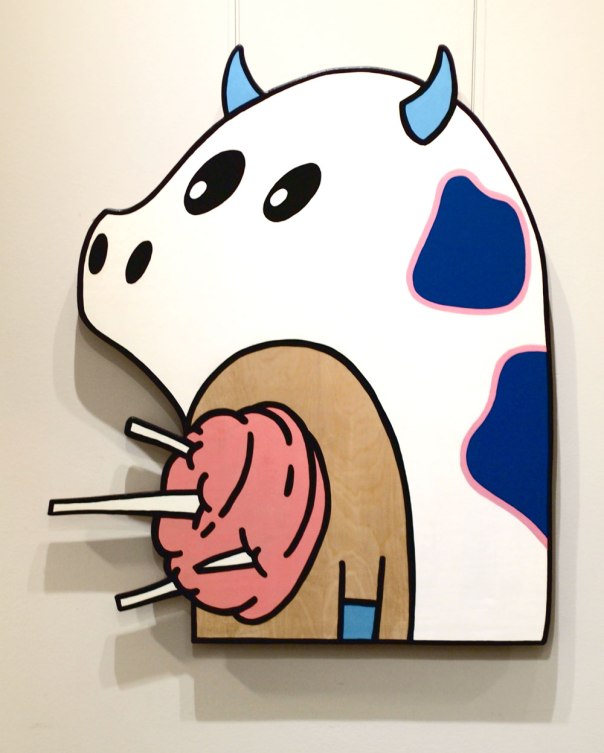 This piece is a little bit larger than fellow SnackHack, Eggaphant. Both are hung via french cleats on the back and come with secondary ‘D’ rings for suspension from wires. CottonCandy Cow stands at just under 3 ft tall by a slightly larger than 3 ft wide (31 1/4″ x 37 1/2″.