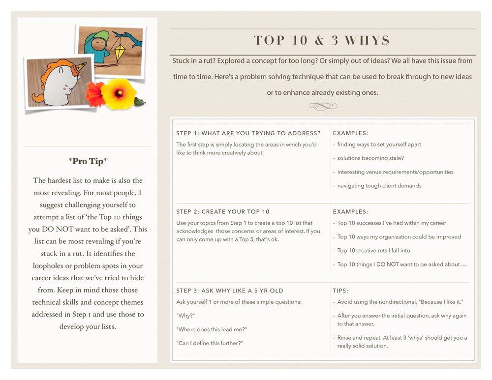Stuck in a rut? Explored a concept for too long? Or simply out of ideas? We all have this issue from time to time. Here’s a problem-solving technique that can be used to break through to new ideas or to enhance already existing ones. Check out “Blowing Through Artist Block” for the complete guide for the Top 10s.