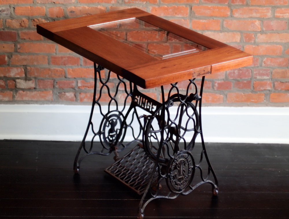 Among my favorite things in this world is finding new lives for really old materials. I’m fascinated by the challenge presented by the reclamation process and often find myself harvesting extremely old parts to use in yet undesigned projects. After restoring a Singer Sewing machine base on a previous piece of furniture (check it out here), I was fortunate enough to have a few more fall into my lap. My latest piece is made from restoring an 1873 Singer Sewing machine base and a chopped mahogany door that I believe is from a schoolhouse of that same era. Both pieces were in severe disrepair and needed considerable restoration before showing their past beauty.