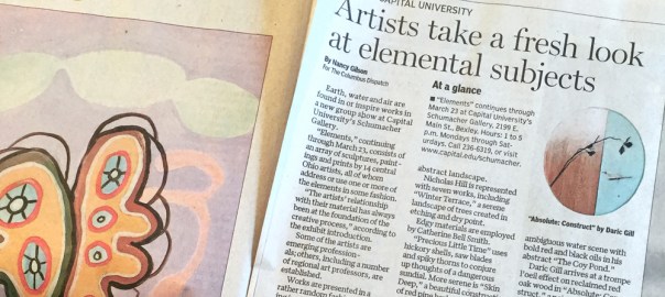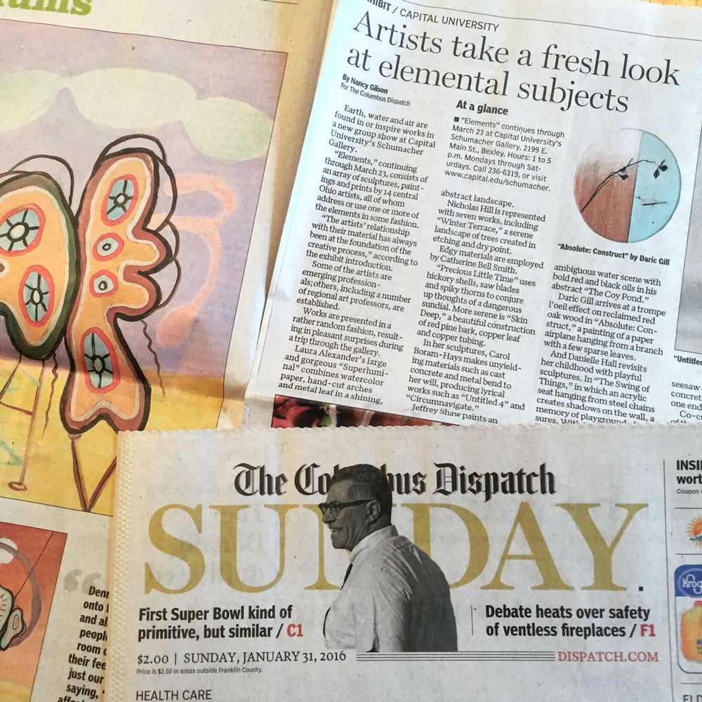 I’m pleased to share that “Elements”, a group show at the Schumacher gallery, was reviewed in today’s Columbus Dispatch newspaper. My work was featured both in the physical paper and the online version. It was also a nice surprise to see my work sharing a spread with my long-time friend & former boss, the late Denny Griffith. A giant thank you to Nancy Gilson who wrote the article.