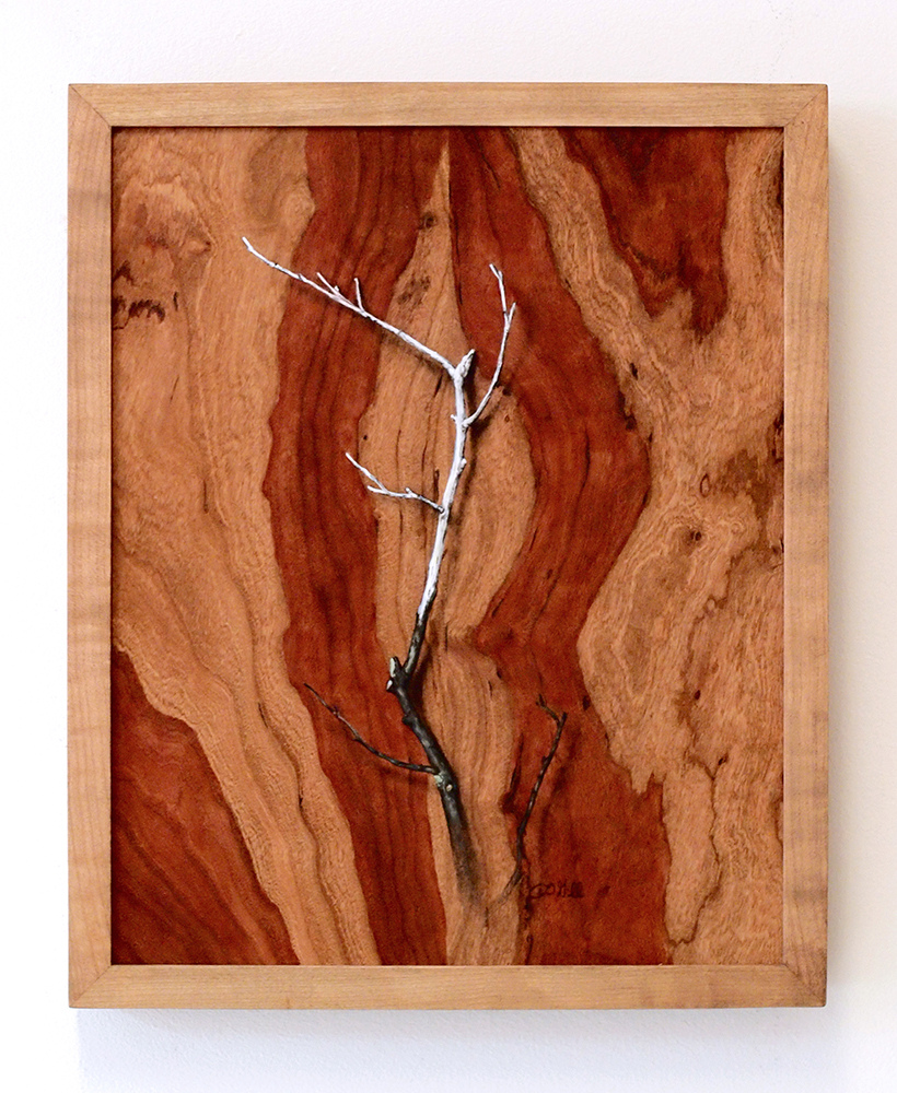 Like most of my paintings, the frame is also handmade. Made from similar cherry wood, the frame has pairs of walnut splines in the corners that serve as structural reinforcement and as accented design elements. The dark color of the splines tie back to the base of the branch.