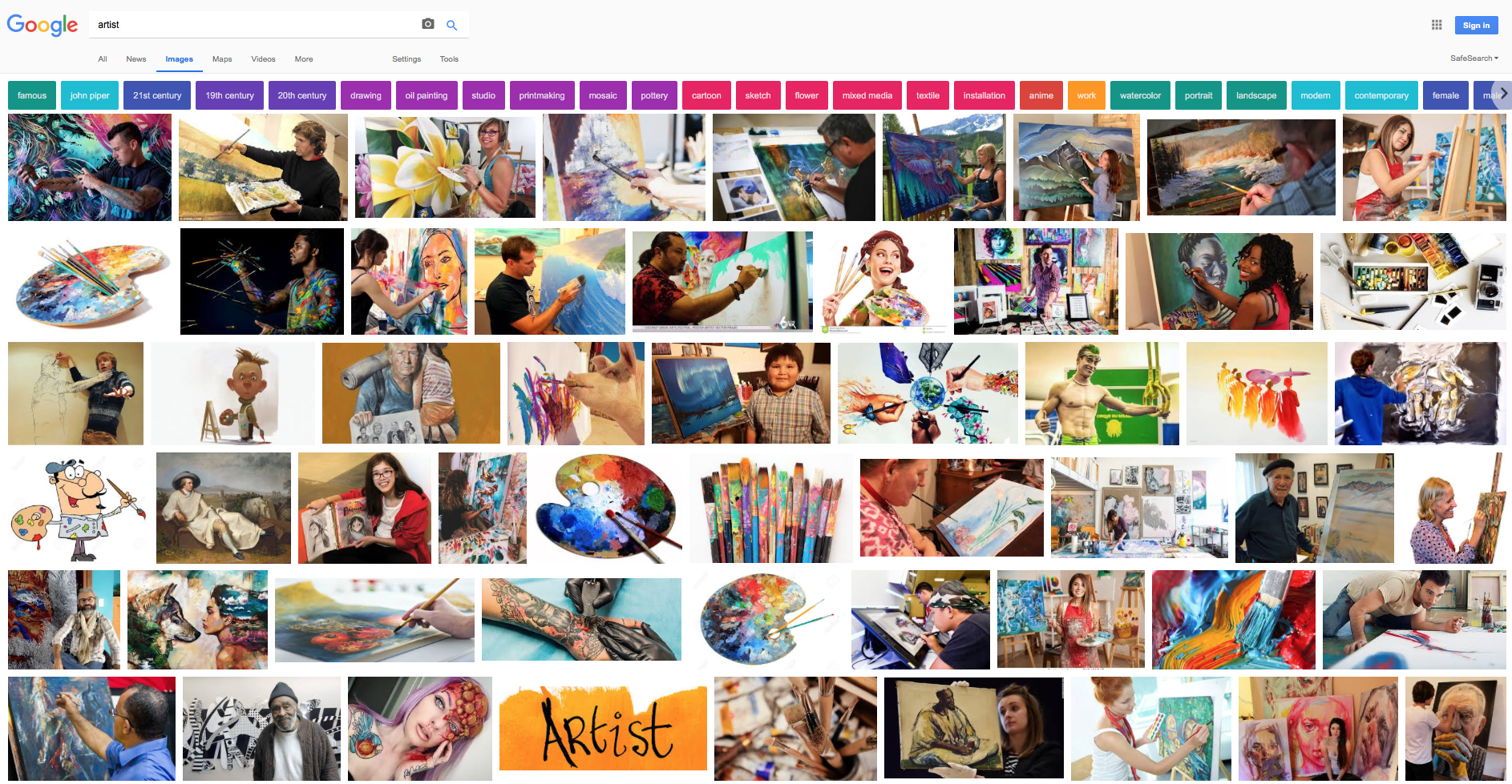 This may describe you as an artist to the T, it might not. But there’s a fundamental problem with the cyclical nature of such a perception. Let’s look at the role of the art career in direct relationship to money. How can anyone possibly expect to be considered a viable option in the world if the lens from which they are reviewed is nothing shy of a second class citizen? Additionally, something quite remarkable happens when you do the same test and simply remove the word “starving”. Googling “artist” will result in a series of bold, colorful, smiling, happy people, successful in almost every photo. Sure, this still smacks of stereotypes, and most photos are tremendously amateur looking, but there’s no denying that the overwhelming theme is positivity rather than squalor.