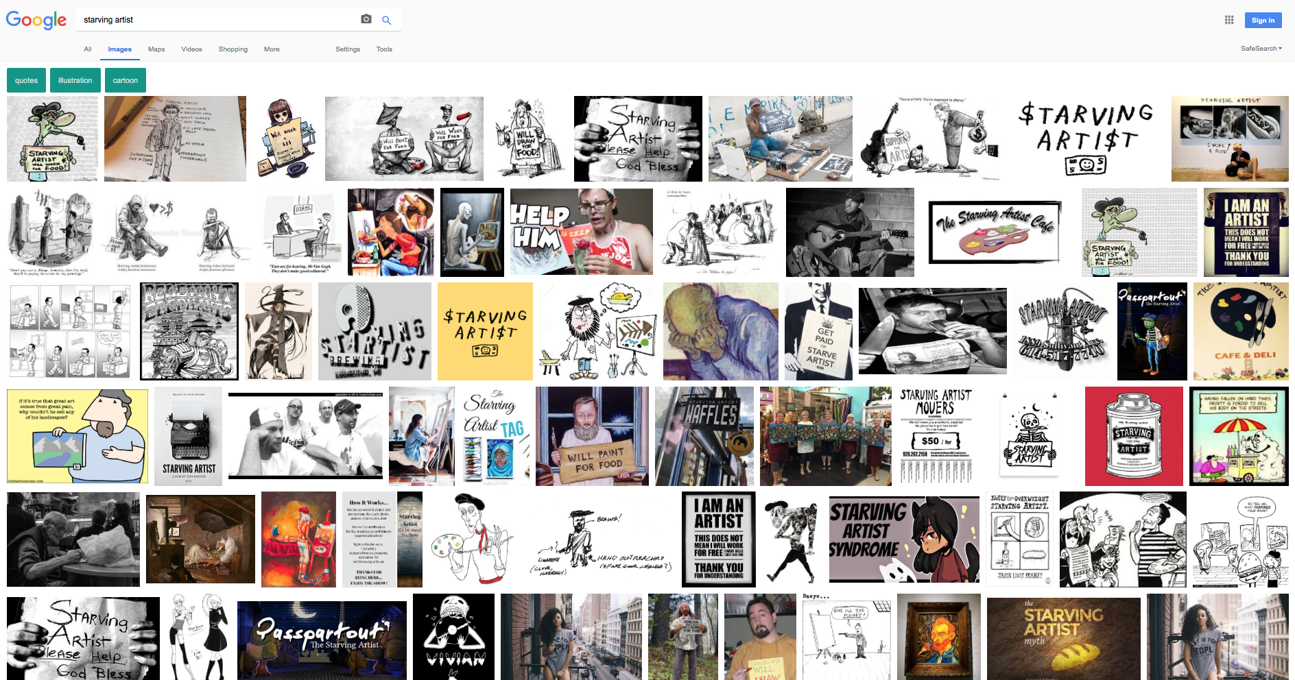 “Starving artist” conjures up images of a befuddled artist, usually with a nasty paintbrush, tattered clothes, and perpetually unable to secure the most basic of living conditions. In other words: an unemployable, destitute, failing waste of a pointless career. If this seems overly dramatic, let’s go to Google image to see what billions of people might see when they type in “starving artist”. The results point to a particularly negative perception of not just the career, but more importantly the person behind the career. The artist is almost exclusively portrayed as unemployed and if not virtually homeless… certainly hopeless. The images show artists as charity rather than as an industry. Click on the image below. Zoom in. Really investigate it.
