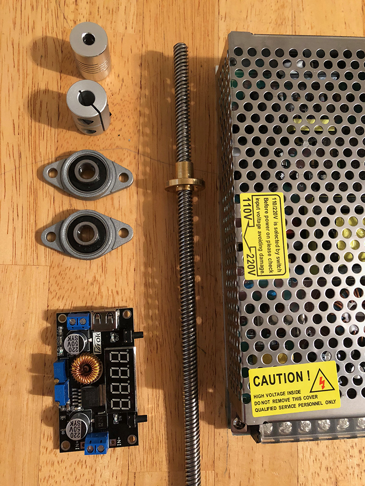 New parts delivered! 120 VAC to 12VDC power supply, lead screw, 5VDC buck converter, 2 versions of a shaft coupler, and shaft bearings.