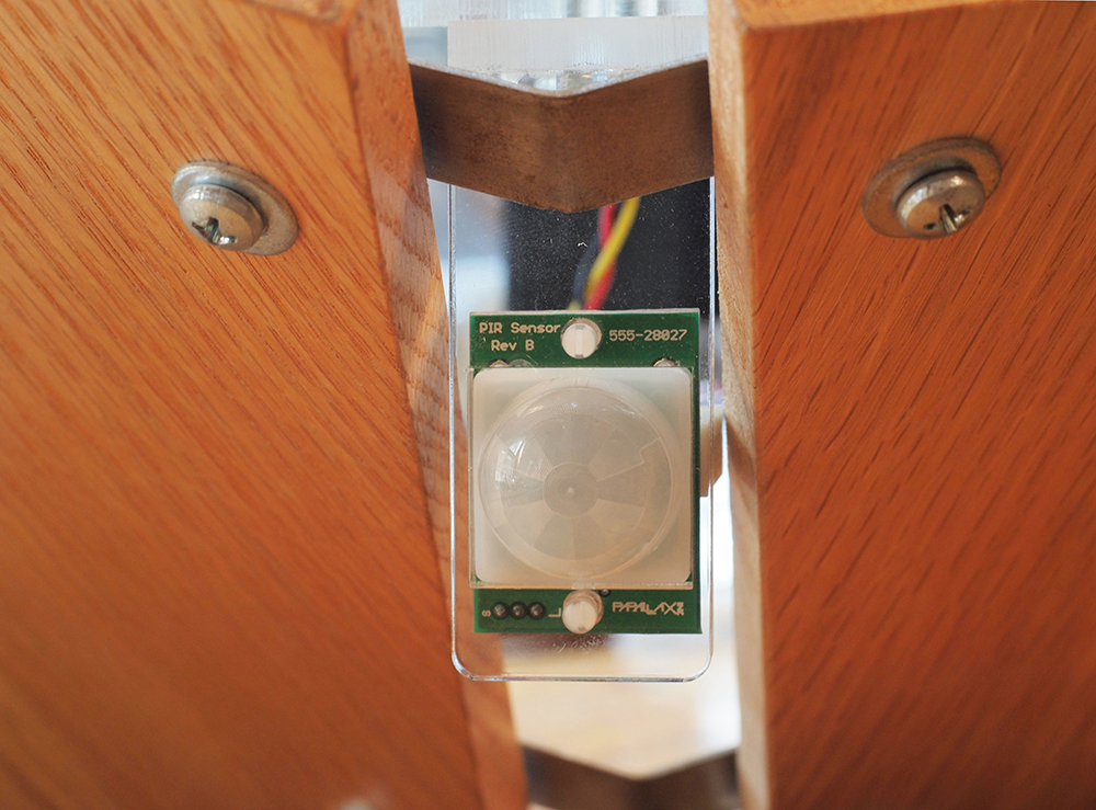 This piece requires interactions to run. A passive infrared sensor is triggered when motion (more accurately body heat) is present in the room. At that moment, the machine takes a quick burst of noise sampling from a microphone amplifier sensor. It measures this sample against a baseline and decides what actions to do next. Depending on the situation, it’ll open or close by running a special type of motor to a predetermined distance. However, without interaction, it sits silent, dark, motionless, and in the exact position in which it was last left.
