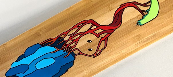 “Roots”, acrylic and marker on bamboo longboard.It’s a great day when you’re given a longboard deck to paint for a good cause. Recently, I have been approached by the owners of Columbus’ very own Hai Poké to do exactly that. Calling back to their roots as skateboarders themselves, owners Nile Woodson and Mico Cordero are finding ways to give back through the forces of local artists + the boarding culture. Longboards like mine will be on display at their brick and mortar shop and will be auctioned off during a charity benefit later next year. I’m looking forward to seeing what comes of all this collaboration and am inspired by the fierce energy by these two tastemakers!