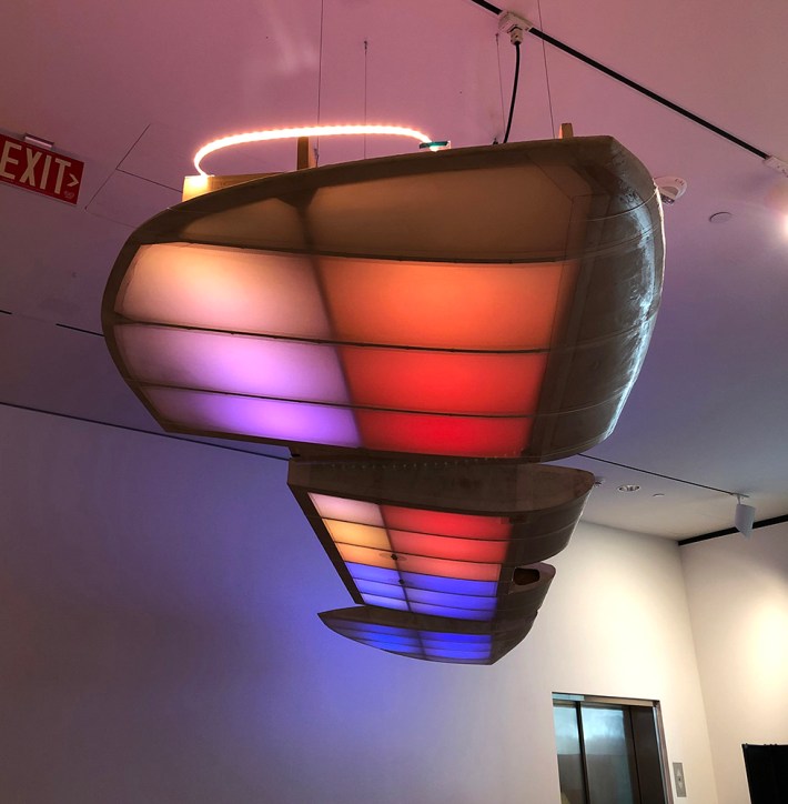 “The Imagination Machine”. Medium: Reclaimed airplane wing, LED lights, Wi-Fi enabled Adafruit Hazzah32 micro-controllers, Adafruit Adalogger with Real Time Clock, PIR motion sensors, electronics, and poplar. 226” x 48” x Dimensions Variable. June, 2019