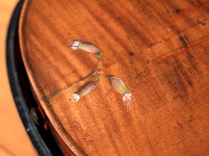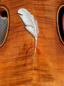 The white plumage from a mist crow rests softly in the center of the curly maple violin back. Tied neatly around the feather’s quill, a thin red thread. The long ends of the bow dangle asymmetrically towards a delicate wildflower. Three ripe buds are about to bloom into dainty white flowers. Its central position aligns with the book-matched maple seam. The feather leans left, the flower weighted to the right.