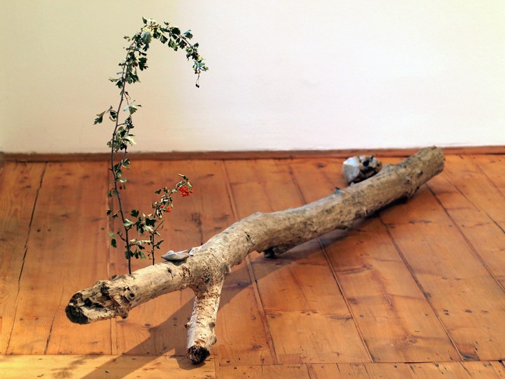 “Absolute: Arrangement 6”: quartz rock, violin key, log, flat stone, thread, feather, two tree branches with berries.