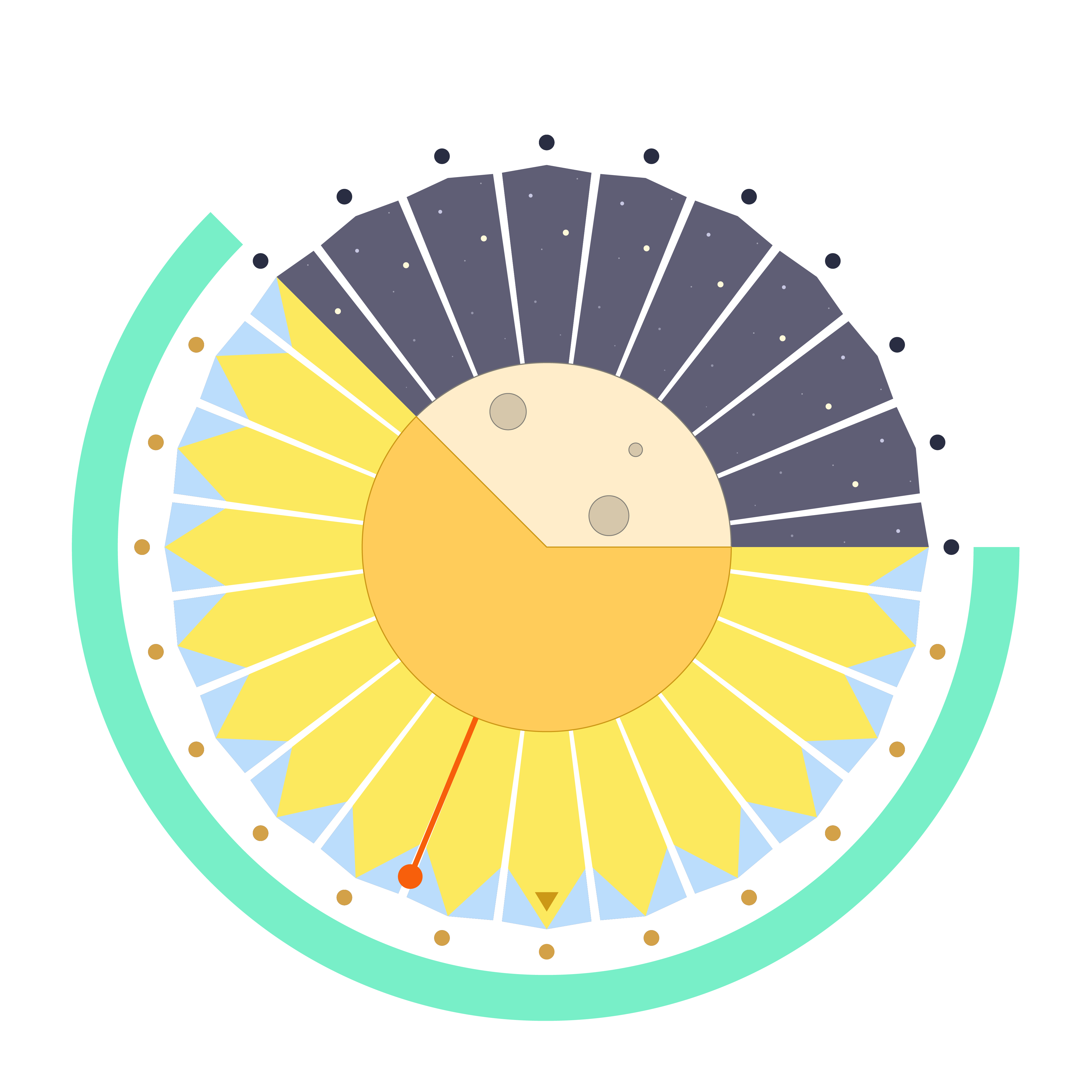 For this robot, Solar Noon (the moment the sun is at its peak height) is also worth celebrating. Like the sunrise and sunset, solar noon is also different each day depending on the coordinates of the robot. Why not show a display of lights and sounds here too?