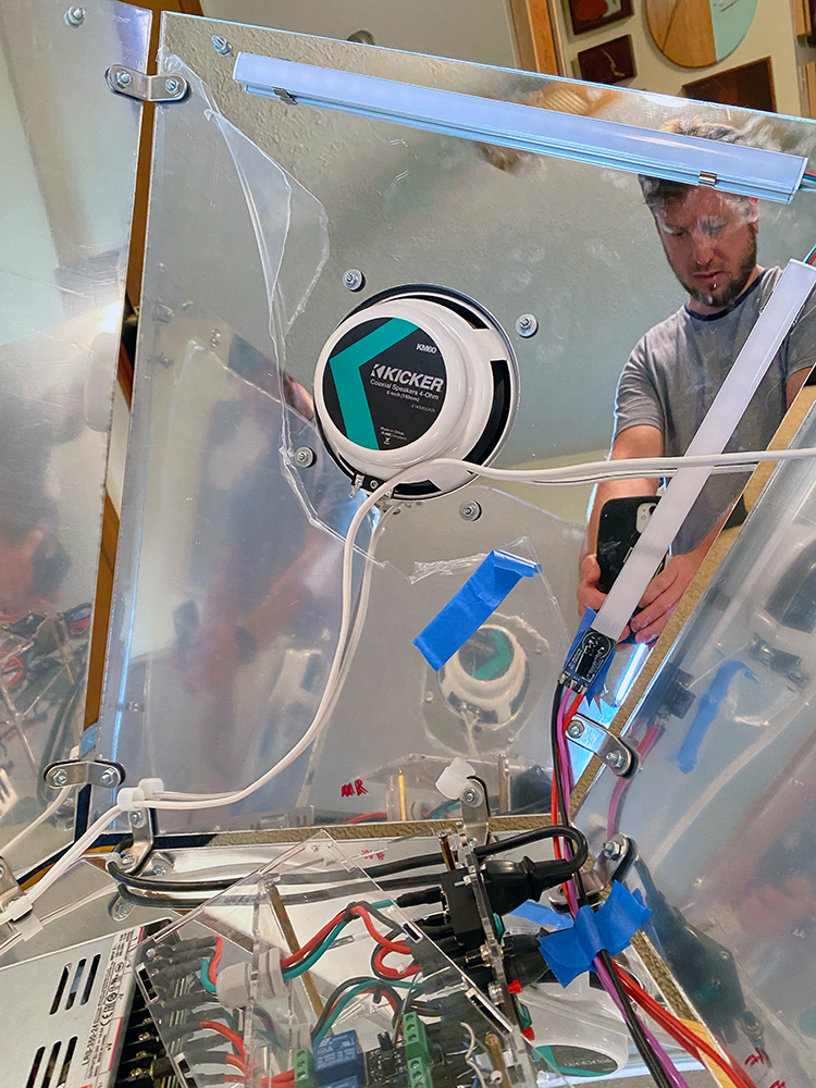 Circadian Machine: Mirror Layer 2 Published on September 2, 2020 in How I Built It: Mirrored Interactive Light + Sound InstallationFull resolution (750 × 1000) ← Previous Next → Assembling the internal mirrored skin & basic vertical electronics layout.