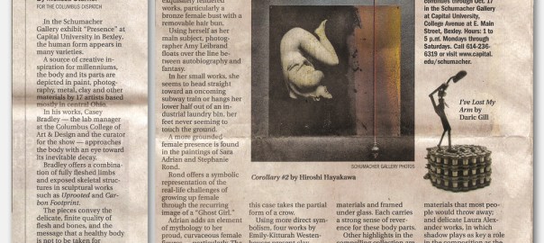 Today I was pleasantly surprised to find that Ohio Art League’s Fall Juried exhibit was reviewed in Sunday’s Columbus Dispatch newspaper. The exhibition showcased 13 artist from Ohio in a group show at the Columbus Cultural Arts Center gallery. My painting, Absolute: Contrive was featured both in the physical paper and the online version.