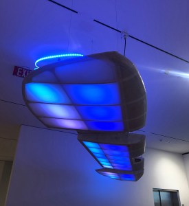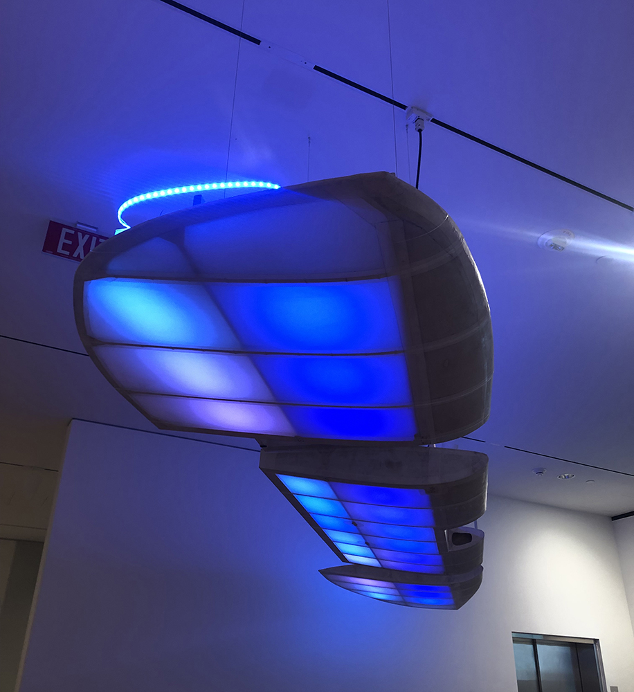 Medium: Reclaimed airplane wing, LED lights, Wi-Fi enabled Adafruit Hazzah32 micro-controllers, Adafruit Adalogger with Real Time Clock, PIR motion sensors, electronics, and poplar.